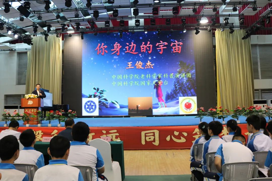 5月8日上午,大弯中学体育馆内“星光熠熠”,一场精彩纷呈的科普盛宴:“弘扬科学精神 播撒科学种子——中国科学院老科学家科普演讲进校园”活动在此隆重举行。中科院国家天文台研究员王俊杰教授亲临现场,为我校初2024级全体同学带来《你身边的宇宙》主题科普讲座。
